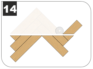 7.7.2 Демонтируйте лишние части плашек с первых треугольников. Используйте их для монтажа открытых частей пола вдоль стены. Укладывайте плашки у стены с учетом зазора для расширения 8 мм.
